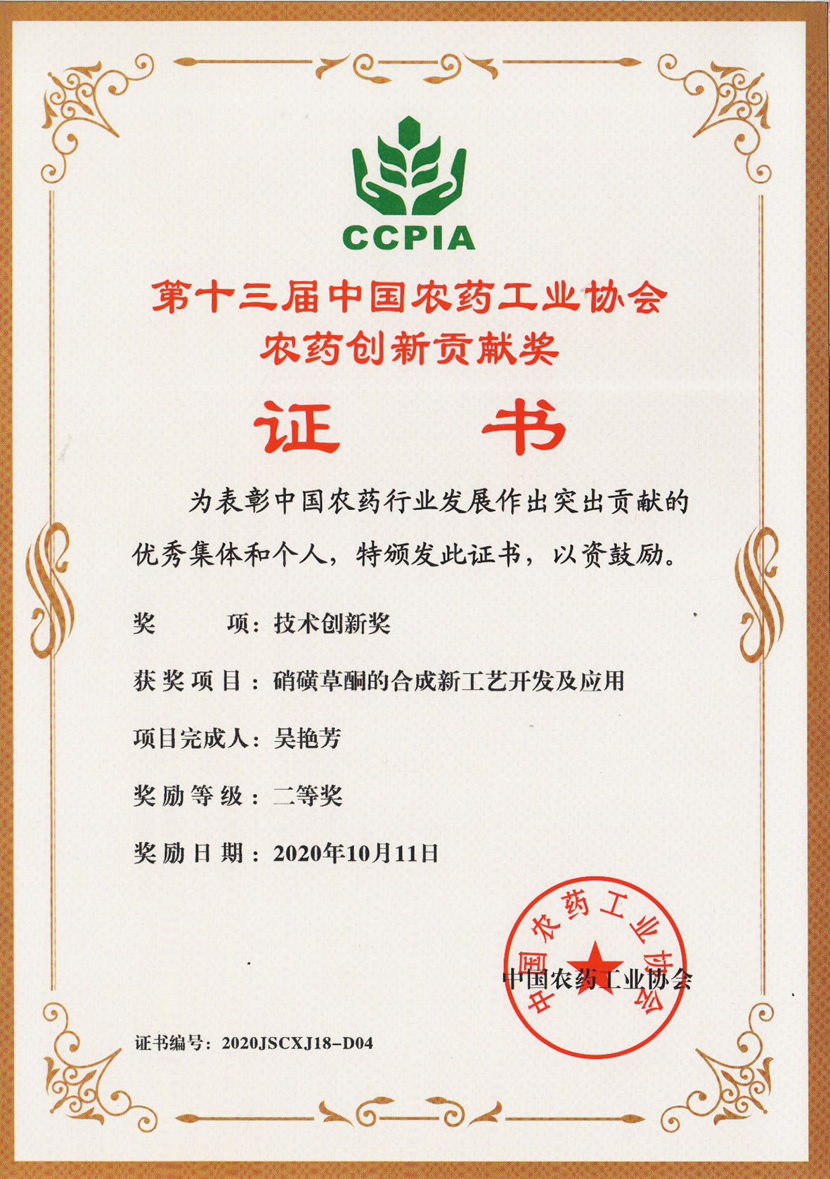 ■2020-11-15 2020-11-05 我公司“硝磺草酮的合成新工藝開發(fā)及應用”項目榮獲技術(shù)創(chuàng)新獎