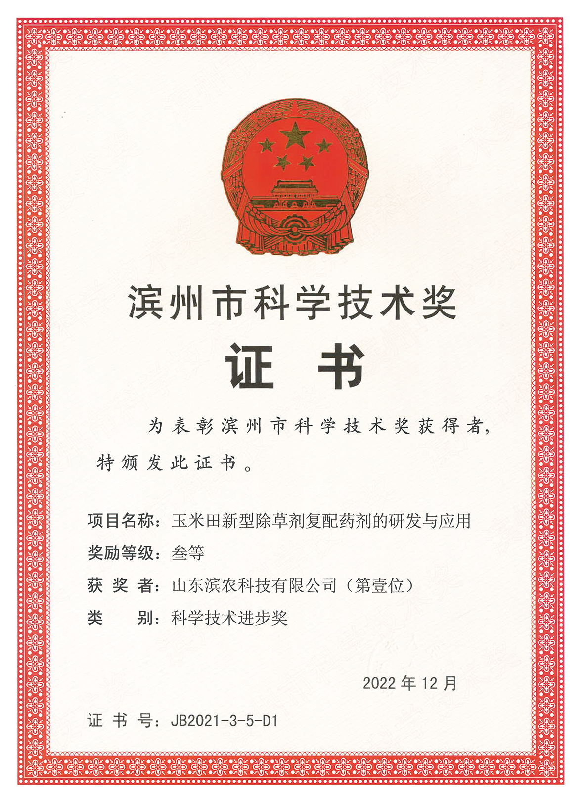 為全面落實黨的二十大精神,加快科技自立自強,深入實施科教興濱,科教興企,創新驅動發展戰略,我公司聯合濱州市農業技術推廣技術中心以及濱州市農業綜合執法支隊申報的“玉米田新型除草劑復配藥劑的研發與應用”項目,根據《濱州市科學技術獎勵辦法》規定,經過初評、市科學技術評審委員會評審、市科技局審核,該項目榮獲濱州市科學技術進步獎三等獎。