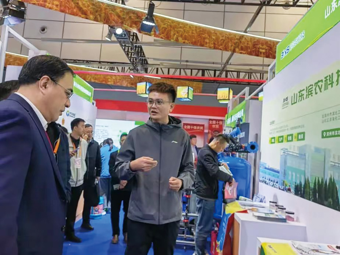 我公司攜多款優勢植保產品精彩亮相,可精準應對各類農作物病蟲害,為作物生長保駕護航。此外,公司還展示了針對小麥、玉米和花生研發的特色藥肥產品,尤其是濱農春華和濱農利豐收,這兩款產品憑借其兼具營養供給與植保防護的雙重功效,受到了廣泛關注。期間,我公司業務團隊與來自河南、安徽、江蘇等不同地區的客戶就植保服務、藥肥產品等關鍵業務領域展開了深入洽談,并初步達成多項合作意向。山東省農業農村廳廳長張紅旗蒞臨公司展位,詳細了解了公司當前發展情況,我公司商務技術部負責人杜兆成簡要闡述了公司在科技創新、產品研發、市場拓展等方面的最新進展與成果,得到了領導的高度評價。